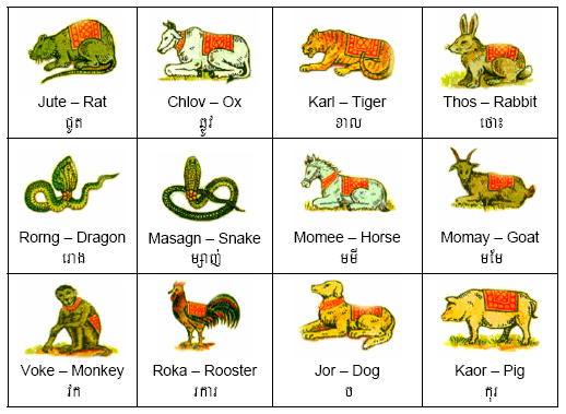 Below is a list of common Khmer art that represent the 12 animals.