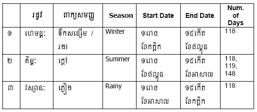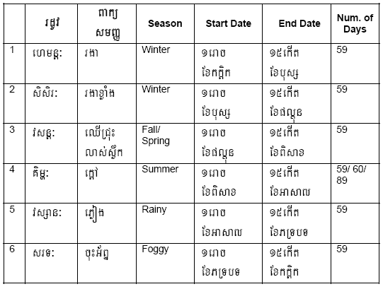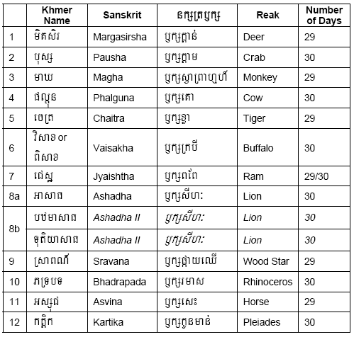 Khmer lunar months are represented using Reak. According to Horas, Reak is group of star constellations that represent each month. Below is a list of lunar months with corresponding Reaks and the number of days.