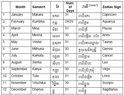 Khmer solar month corresponds to western zodiac symbols. A year is divided into 12 Reaseys. Reasey is the measurement of the path of the sun and the moon that is divided into 30 degrees each. Below is a list of months and its meaning