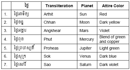 The table below shows the day of the week and its corresponding planets or celestial bodies. Color for Khmer traditional attire for each day of the week is also listed.