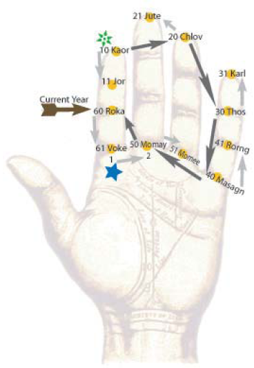 The 12 orange dots are the different positions used in this method. The animal years are positioned for the year of Roka (2005). This varies from year to year. The current animal year starts at “Current Year” arrow (second knuckle of the pointing finger) and counts clockwise to the successive years. The flower star is where you start if the age is at least 10 years old or else start at the blue star marked as 1 going counter clockwise up to 9.